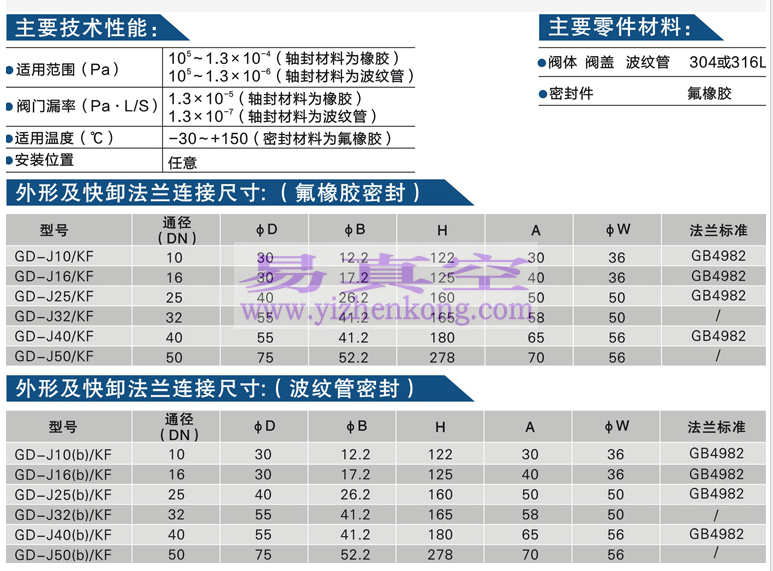 GD-J型系列高真空挡板阀是用于真空系统中接通或切断气流之用。传动部件采用螺杆传动升降阀板,动作轻巧、工作可靠。高真空挡板阀轴封结构可分为GD-J型橡胶密封和GD-J(b)型波纹管密封两种。GD-J型为角通型式,GD-S型为带预抽口的三通型式。 适用的工作介质为空气及非腐蚀性气体。
