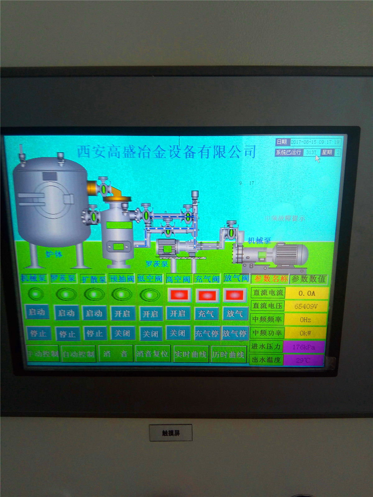 充放气系统:向炉内充入惰性气体(氩气)。充气阀门、充气管道、气源、气体流量计,放气阀等