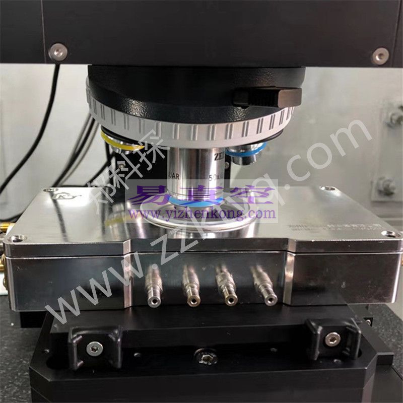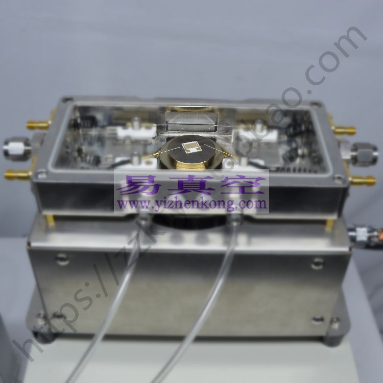 该腔体设计有进气口和抽真空接口其真空度用机械泵可达<5Pa分子泵可达<-3Pa。真空信号连接处使用军工级别真空电极信号接头,保证气密性及抗干扰性能。使用时将需将待检测的器件方在加热台面,探针顶尖处由3轴可移动探针手动调节移动至被测试器件的引脚处,外部信号线连接测试仪器来测试电学信号。