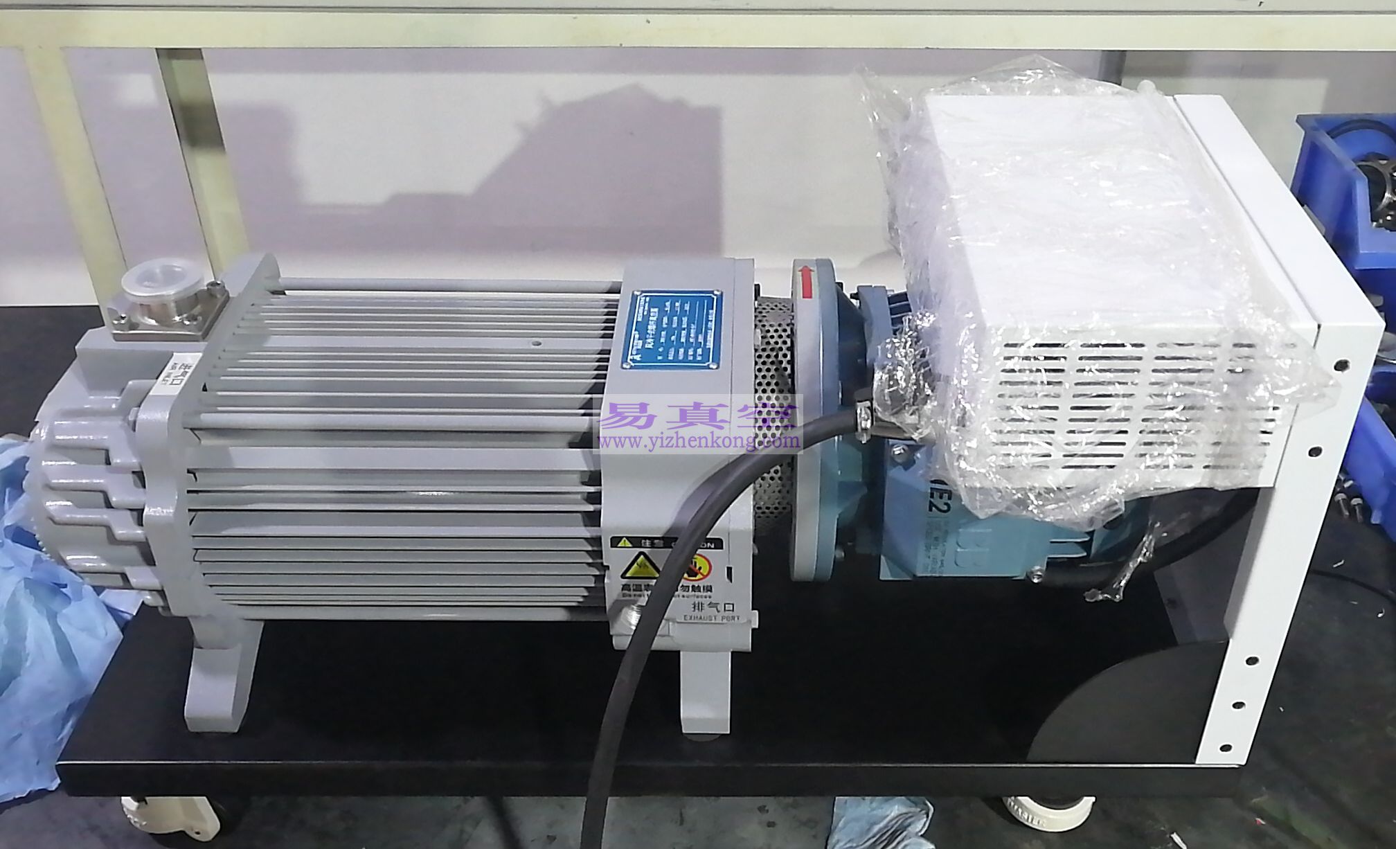 干式复合螺杆真空泵是由两根平行的螺杆转子与泵体之间形成密封空间,在转子与转子和转子与泵体之间保持一定转动间隙无摩擦,在反向同步齿轮驱动下,气体持续由进气口进气向排气口排气的真空泵。因为转子和泵体之间没有摩擦,保持泵腔干净,无需润滑油,螺杆真空泵可以抽除大量水蒸气、溶剂、少量粉尘,以及用于气体和溶剂回收等工艺。螺杆真空泵无中间隔板(多级爪式真空泵和多级罗茨真空泵有),持续推进,气体通道短,效率高,易清洗,不易阻塞,具有显著的优点 。