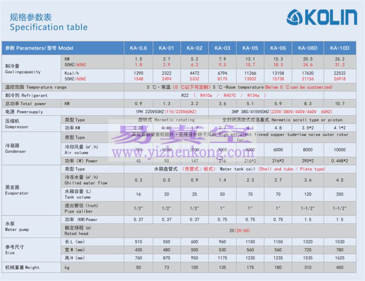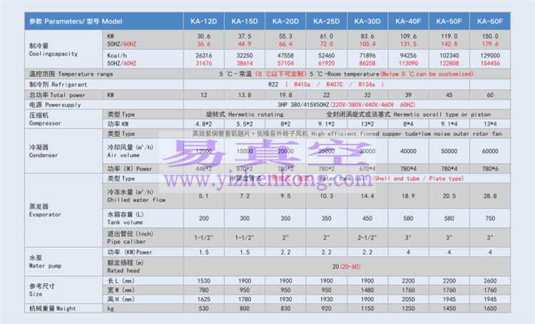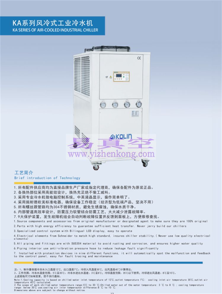 RA系列风冷式工业冷水机广泛应用于塑胶、电子制造、电镀、、化工、超声波冷却、印刷、真空镀膜等工业生产,它能精确控制现代工业机械化生产所要求温度,从而大大提高了生产效率及产品质量。科凌工业冷水机操作简便、设计合理、品质**,规格齐全,是现代化工业生产**缺少的得力助手。主机精选欧、美、日全新世界**压缩机,制冷效率高,低噪音,节省电能,安全环保耐用。标配304不锈钢水箱盘管式蒸发器,内置自动补水等装置,清洗维护方便快捷,(可选不锈钢板式蒸发器或干式壳管式蒸发器)。冷凝器采用优质**锅管散热器;水冷机组为**内螺纹铜管壳管式冷凝器,风冷机组为**铜管翅片式冷凝器。制冷配件采用丹佛斯、爱默生等世界**产品,确保机组工作稳定性和使用HA寿命。采用新型环保制冷剂,无臭氧破坏,可根据不同**和地区选用R404A、R134a、R407C等不同的环保制冷剂。采用优质**水泵,大排量,低能耗,省电耐用,扬程和泵体材质可选配;水管路可根据要求选配不锈钢、工业塑料或镀锌材质。电气部分采用国际**“施耐德”产品,配**冷水机液晶显示温度控制器,具有强大的自我诊断功能,工作稳定性高,操作简便,水温控制精确度可达士0.5℃,设定温度范围5℃-50℃。可根据不同**和地区的电源要求定制特殊电源。